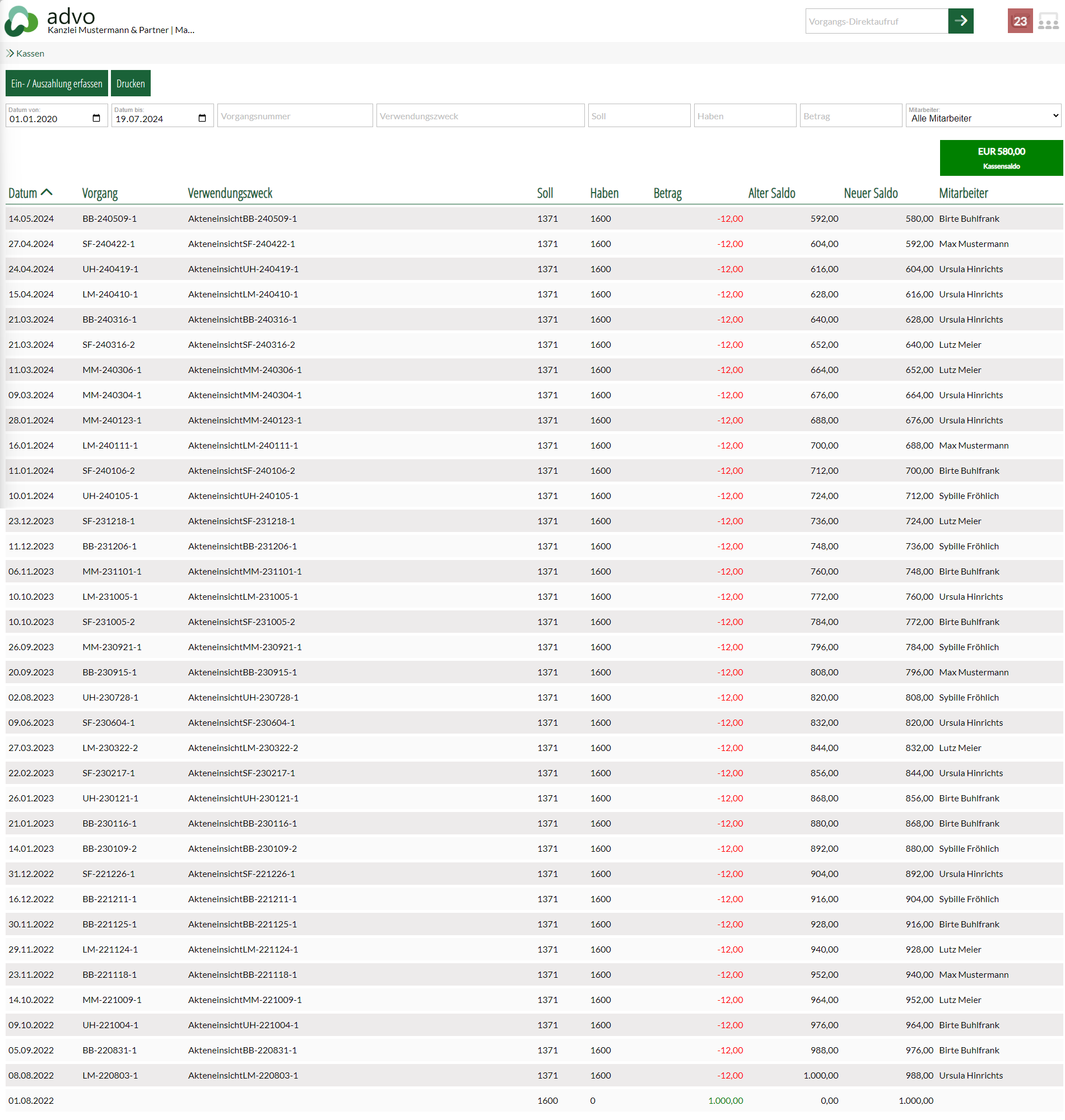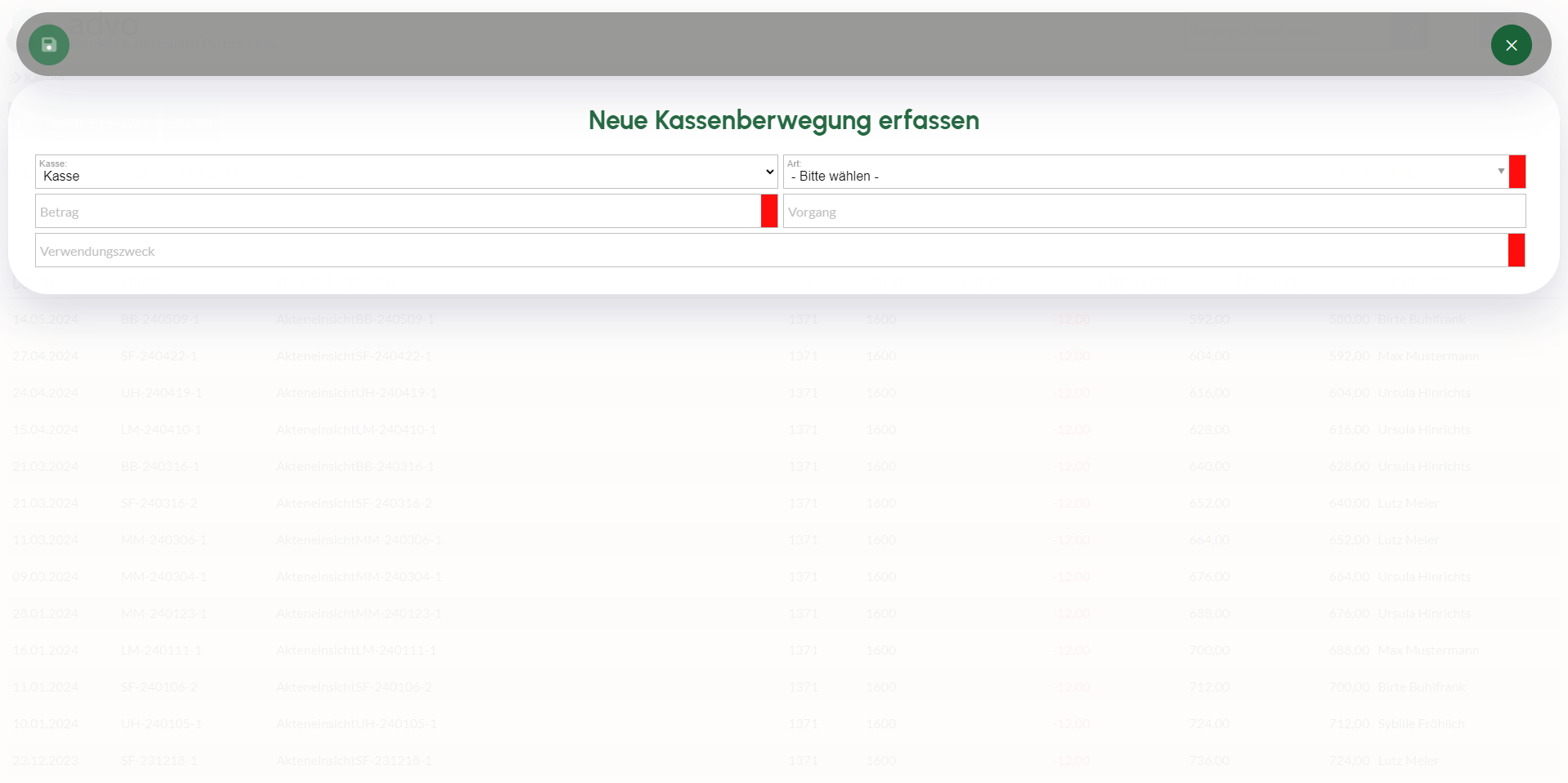 Haben Sie eine Kasse? Dann ist unser Kassenmodul genau das Richtige für Sie. Führen Sie das Kassenbuch digital in unserem System und ordnen Sie Ein- und Auszahlungen direkt den entsprechenden Vorgängen zu, um den Überblick zu behalten. Unser Modul zeigt immer den aktuellen Bestand und die letzten Kassenbewegungen an, sodass Sie jederzeit nachvollziehen können, wer welche Summe zu welchem Zweck entnommen oder eingelegt hat.