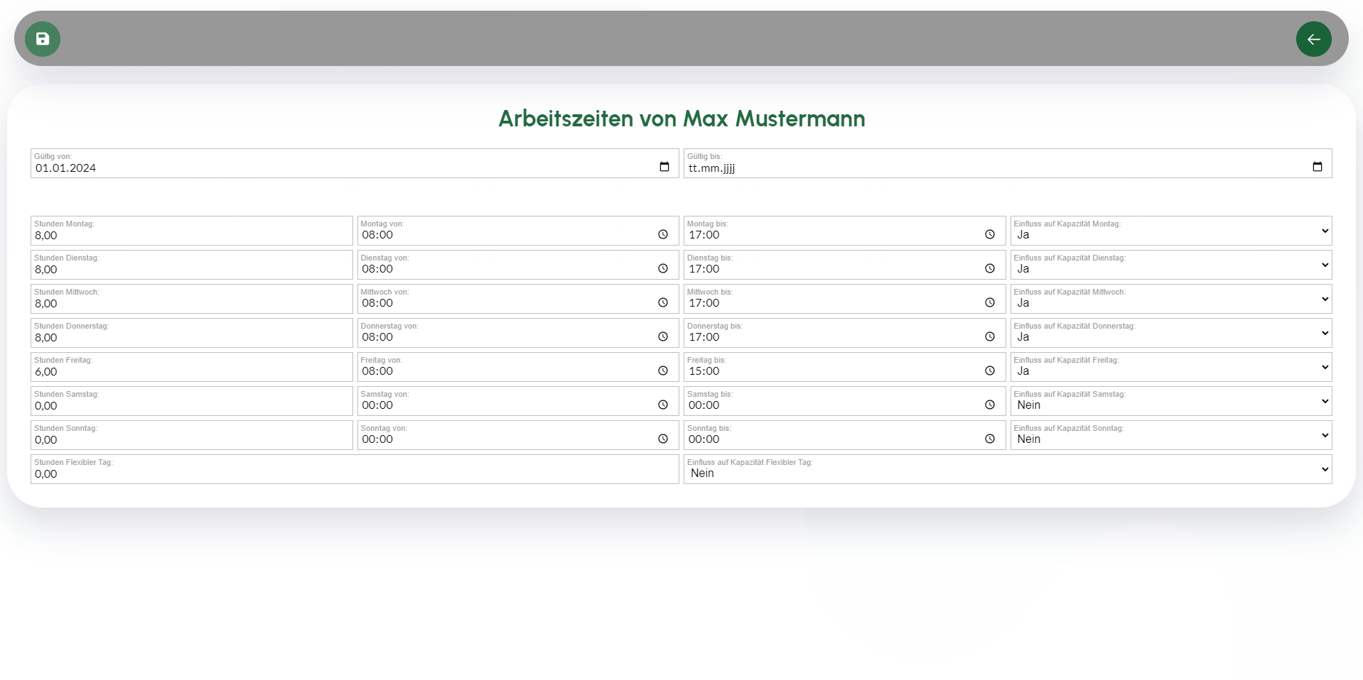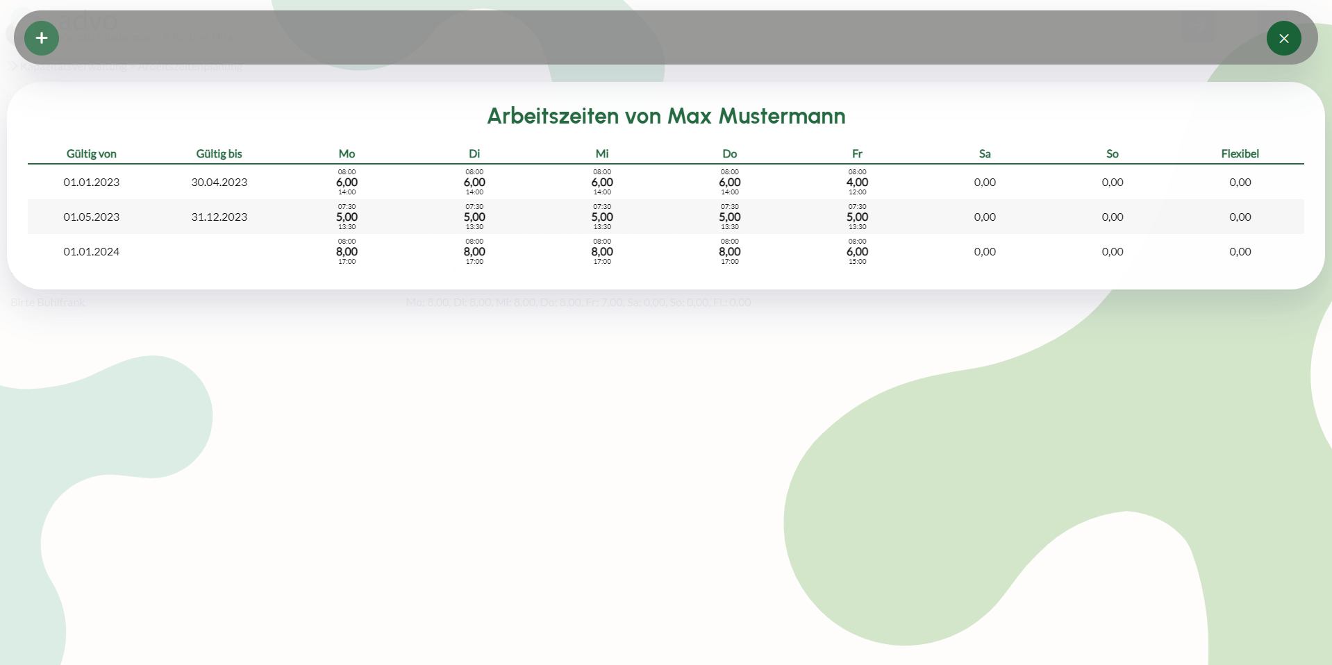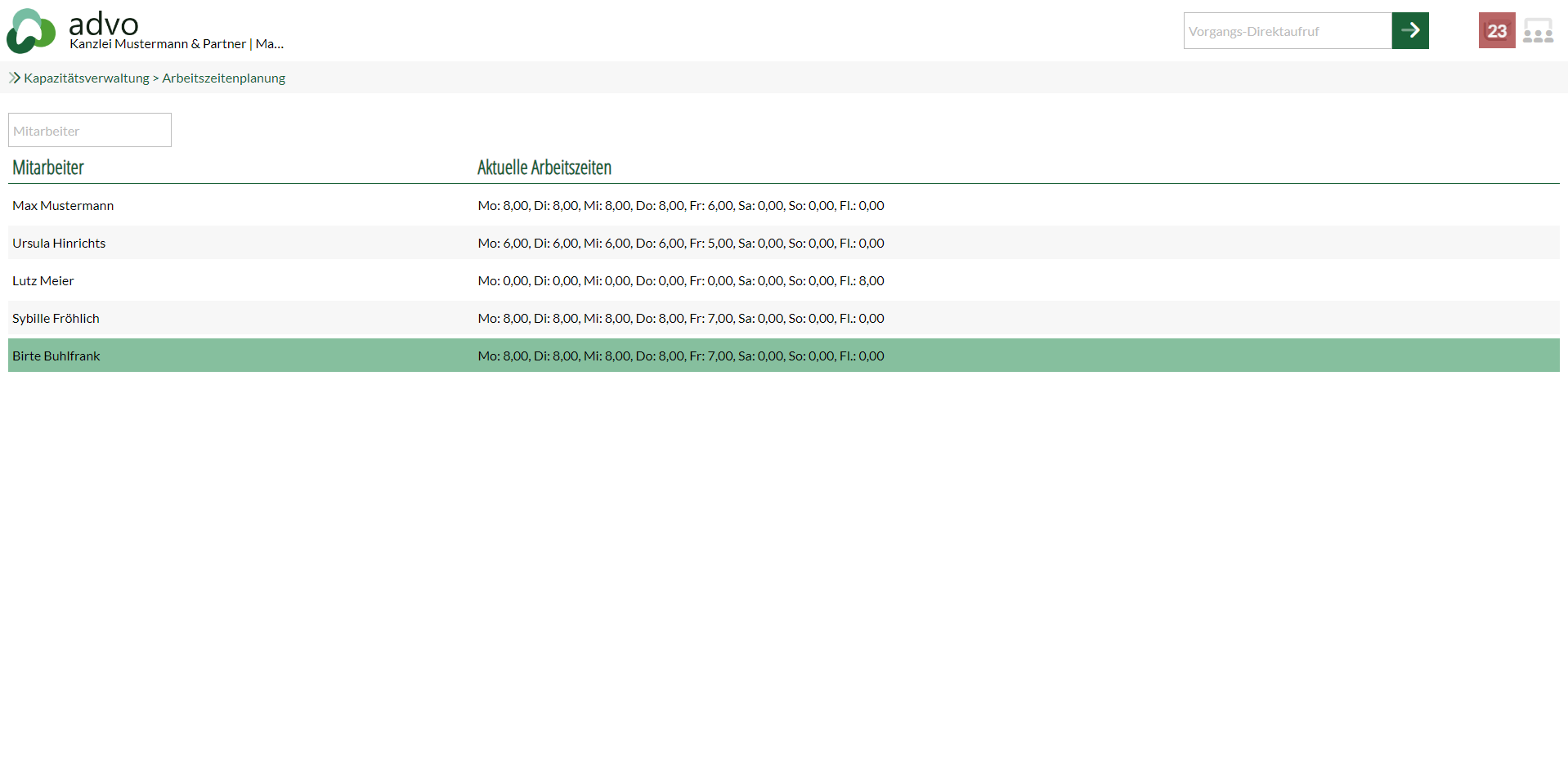 Verwalten Sie die regelmäßigen Arbeitszeiten Ihrer Mitarbeiter direkt in TREVI advo. Diese Arbeitszeiten können bei der Terminplanung berücksichtigt werden. Darüber hinaus ist es möglich, intern anzuzeigen, wann ein bestimmter Mitarbeiter das nächste Mal arbeitet.