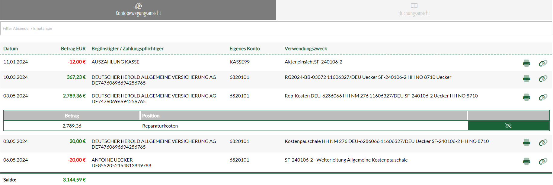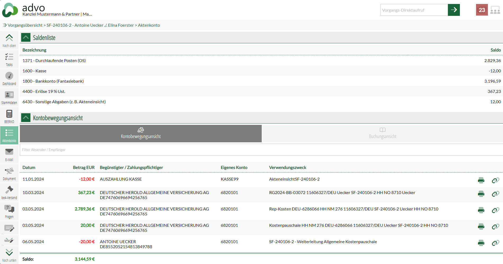 Im Aktenkonto kann der Sachbearbeiter präzise nachvollziehen, welche Zahlungen bisher eingegangen und ausgegangen sind und auf welche Positionen diese zugeordnet wurden. Für detaillierte Einblicke bieten wir Spezialisten zudem die Möglichkeit, den Buchungsauszug der Akte aus der Buchhaltung einzusehen. Auf diese Weise lassen sich alle Buchungen akkurat nachverfolgen.