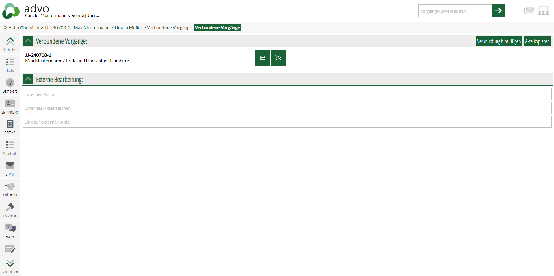 Wenn Sie einen Mandanten in mehreren Parallelakten vertreten, können Sie diese miteinander verknüpfen. Das ist besonders nützlich, wenn Sie beispielsweise bei einem Verkehrsunfall sowohl zivilrechtliche Schadensersatzansprüche als auch ein Ermittlungsverfahren wegen fahrlässiger Körperverletzung betreuen.