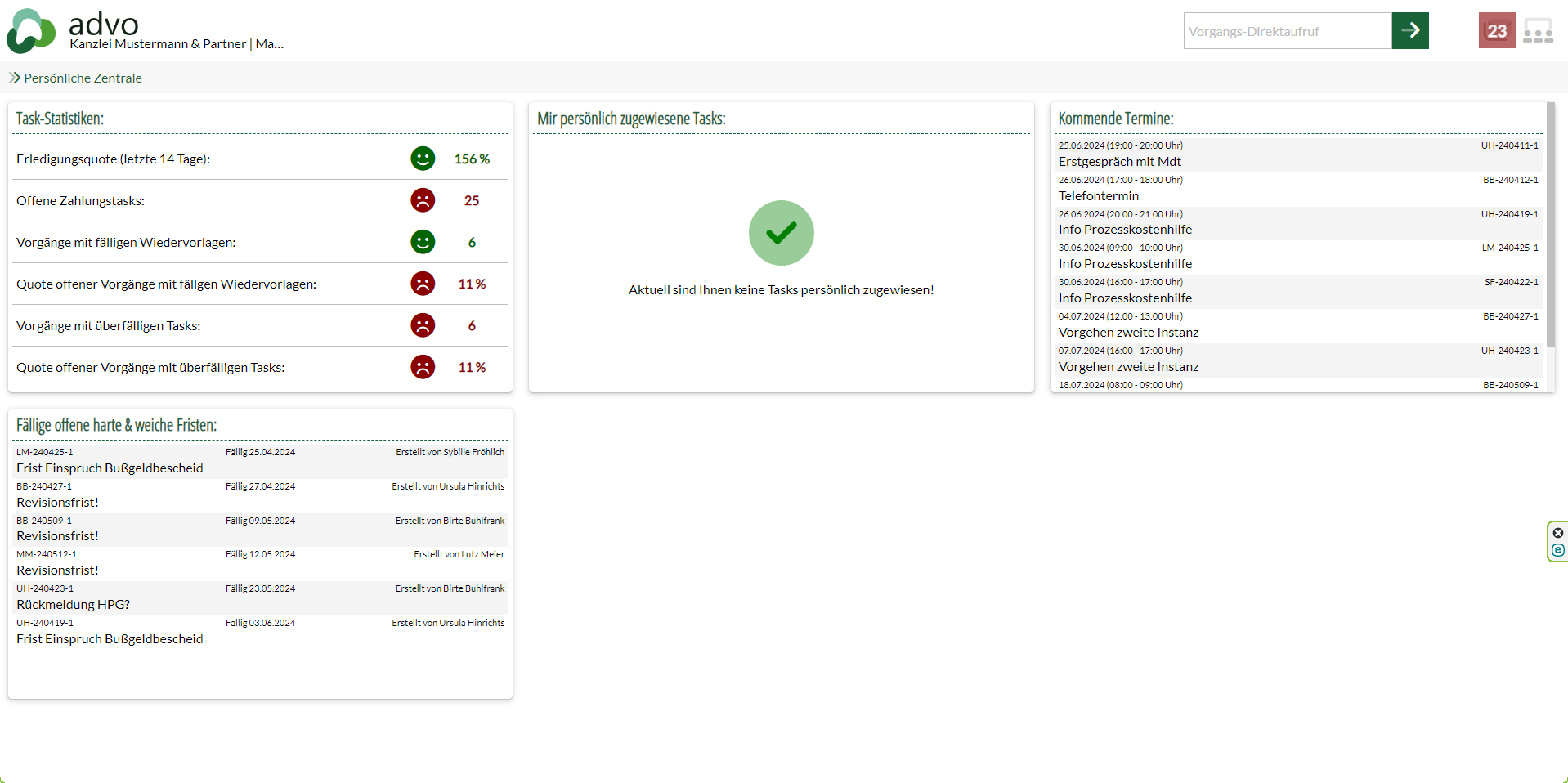 Die persönliche Zentrale ist die erste Seite, die Sie nach dem Login sehen. Hier werden Ihnen die wichtigsten Informationen übersichtlich zusammengefasst. Sie können sich einen ersten Überblick über anstehende Termine und kommende Fristen verschaffen.