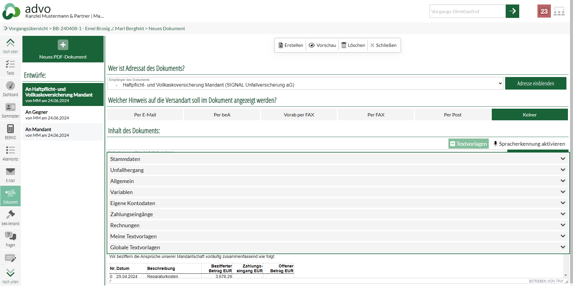 Unsere Textvorlagen können vielseitig eingesetzt werden: bei der Dokumentenerstellung, dem Versand von E-Mails sowie beim Erstellen von Notizen und Vermerken. Diese Funktionen unterstützen Sie dabei, Ihre Arbeit effizienter und strukturierter zu gestalten.
