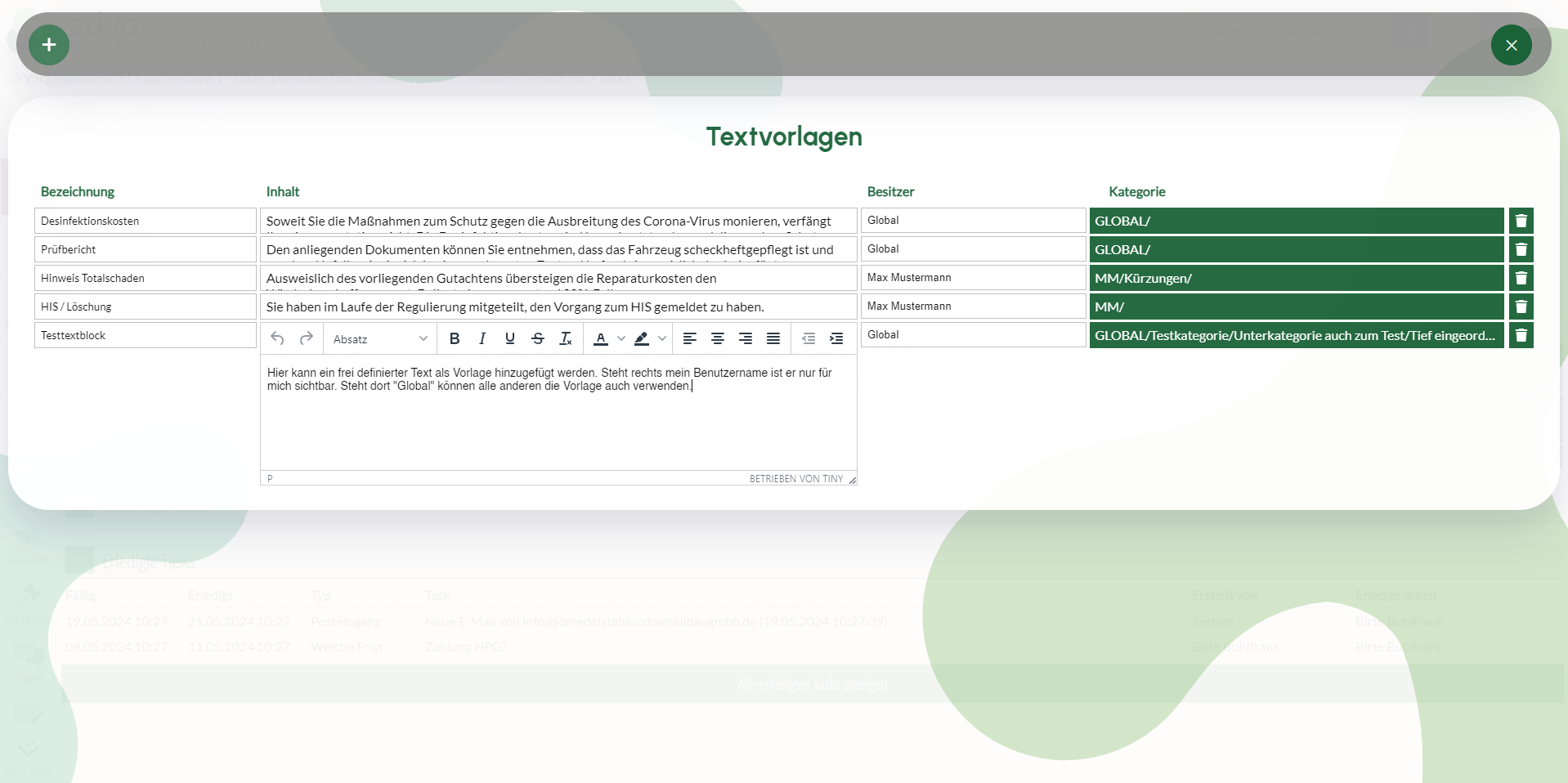 Neben umfassenden PDF-Vorlagen, die Ihre gewünschten Schreiben in Sekundenschnelle erstellen, bieten wir Ihnen die Möglichkeit, individuelle Textbausteine direkt im System zu hinterlegen. Jeder Benutzer kann eigene Textvorlagen speichern, die dann exklusiv für diesen Benutzer verfügbar sind. Administratoren haben zudem die Option, besonders gelungene Textvorlagen für alle Benutzer zugänglich zu machen.