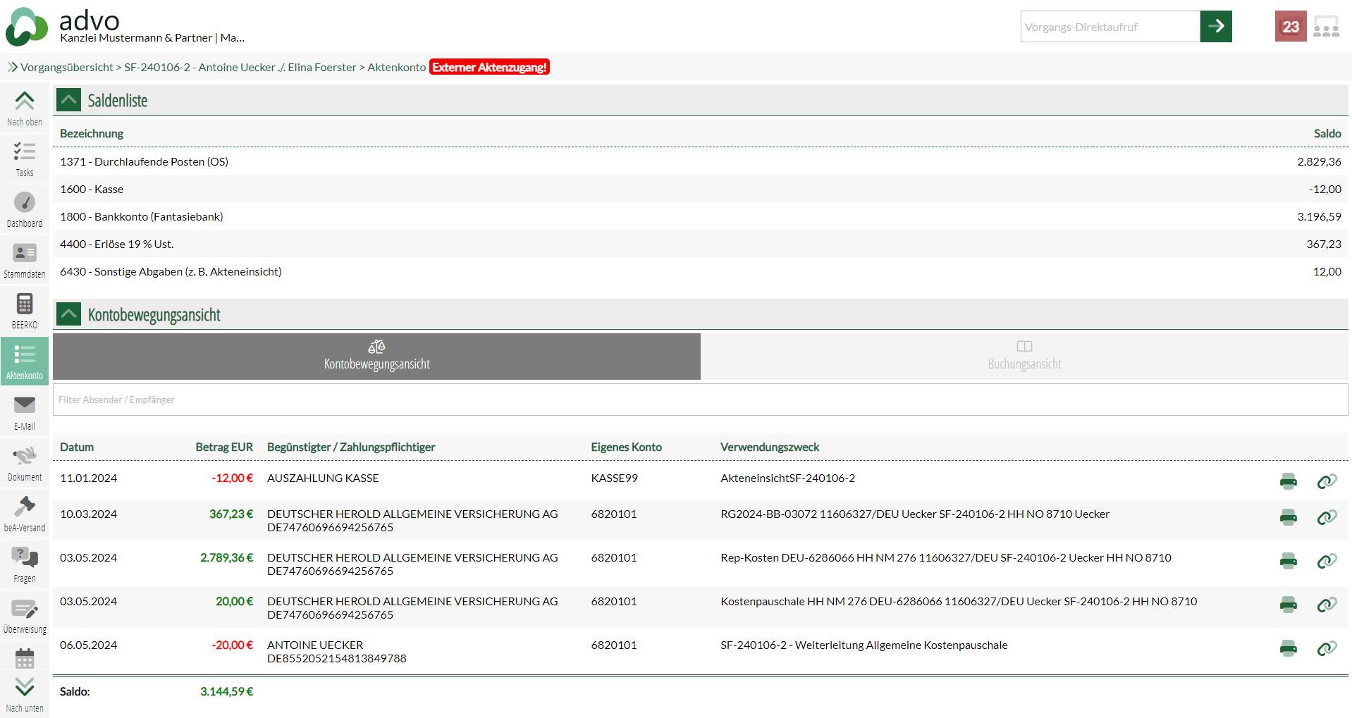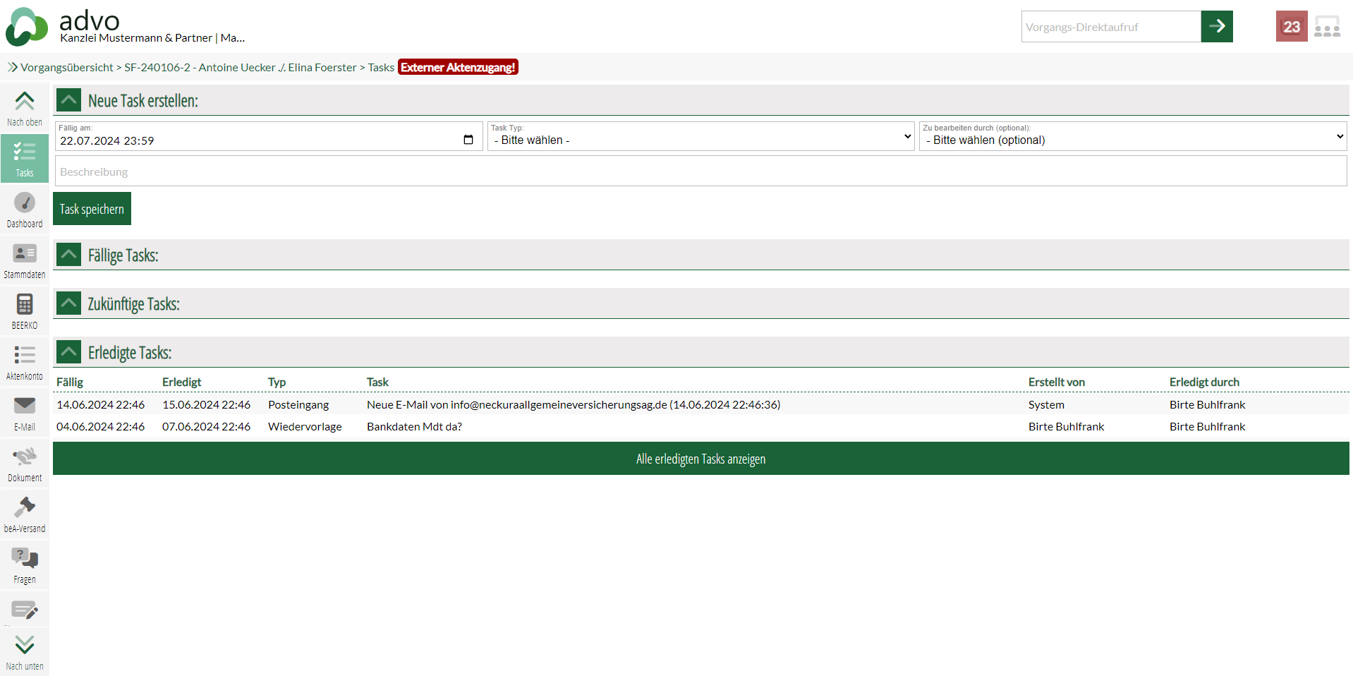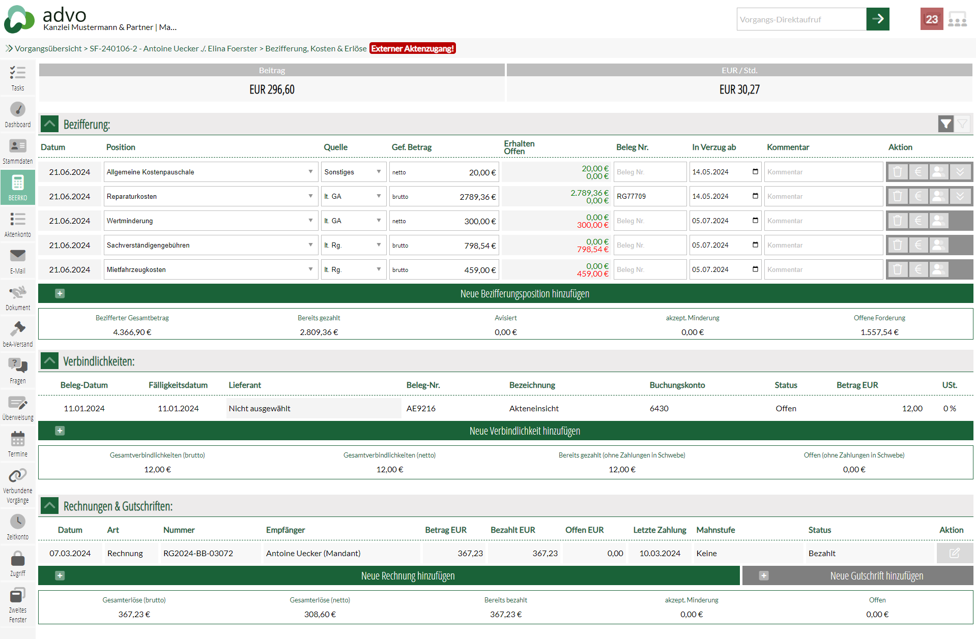 In jedem Vorgang stehen Ihnen diverse Funktionen zur Verfügung. Neben einer Taskübersicht, der Stammdatenverwaltung, der Möglichkeit Bezifferungen vorzunehmen und Verbindlichkeiten und Rechnungen zu den jeweiligen Vorgang zu verwalten, könenn Sie hier auch Dokumente erzeugen oder E-Mails versenden. Von hier aus können auch Vorgangszugänge für Ihre Kunden erstellt werden und Rückfragen für diese eingestellt werden. Hier gibt es viel zu entdecken. Die Screenshots sollen Ihenn hier nur einen kleinen Blick in das Programm ermöglichen.