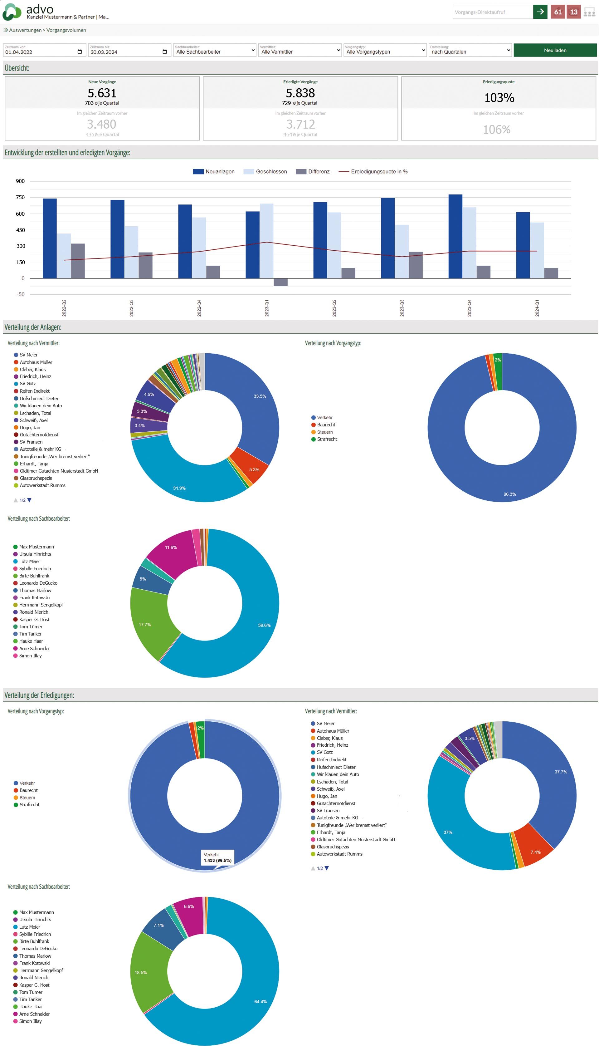 Erfahren Sie mit einem Klick, wie Ihre aktuelle Mandatslage aussieht. Überprüfen Sie, wie viele neue Akten Sie im Verhältnis zu erledigten Akten angelegt haben und auf welche Vermittler, Sachgebiete und Sachbearbeiter sich die Neuanlagen und Erledigungen verteilen. Dies ist ein hervorragendes Instrument, um die wirtschaftliche Situation und Perspektive Ihrer Kanzlei besser einschätzen zu können.