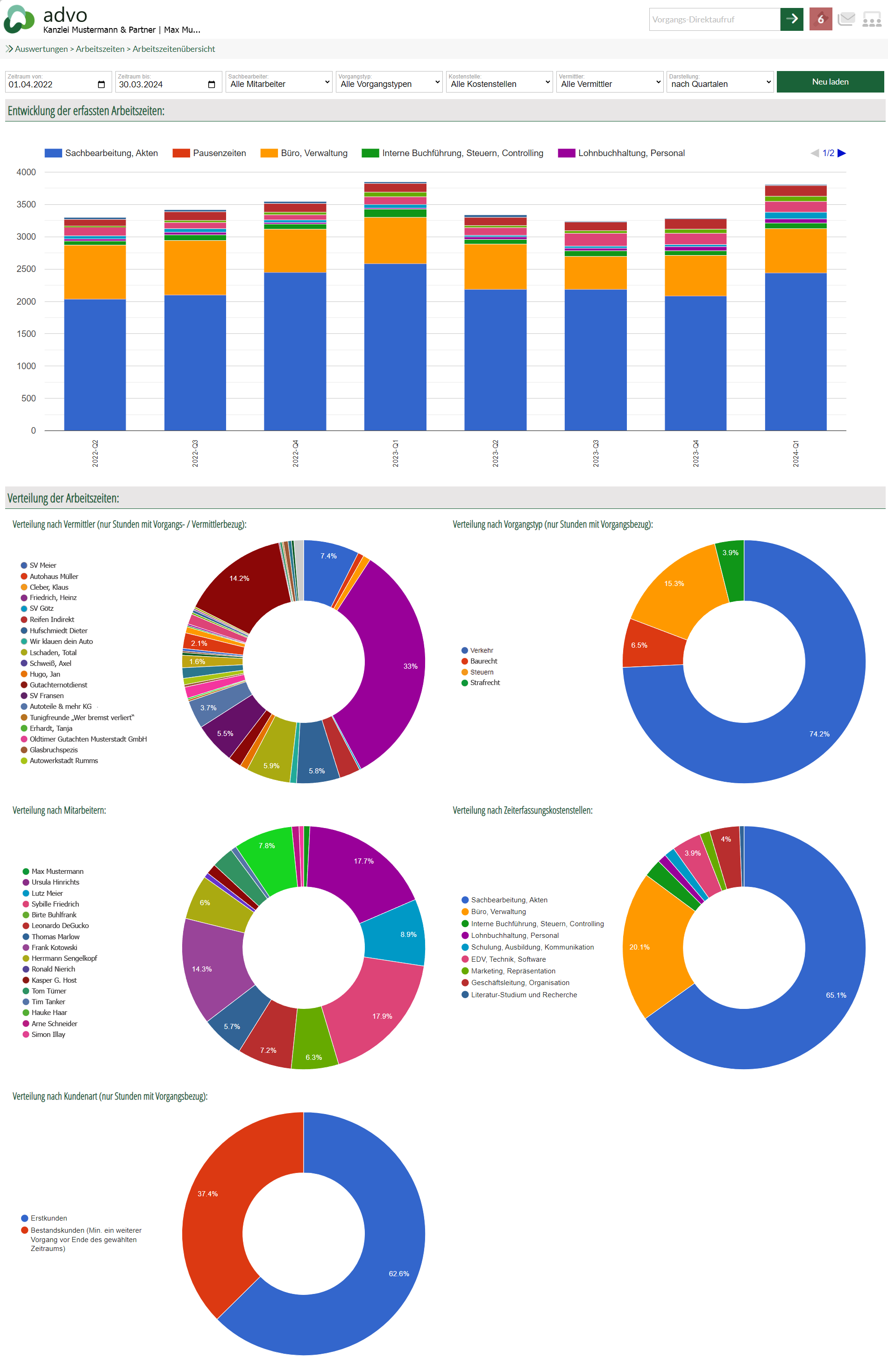 TREVI advo bietet Ihnen eine Vielzahl an Funktionen, um die Entwicklung der Arbeitszeiten in Ihrer Kanzlei detailliert zu analysieren. Sie können genau sehen, wie viele Stunden geleistet wurden und wie sich diese nach Vermittlern, Vorgangstypen, Mitarbeitern, Kostenstellen oder Kundenarten aufteilen. Diese umfassenden Auswertungen ermöglichen es Ihnen, wertvolle Einblicke in die Arbeitsabläufe und die Effizienz Ihrer Kanzlei zu gewinnen.